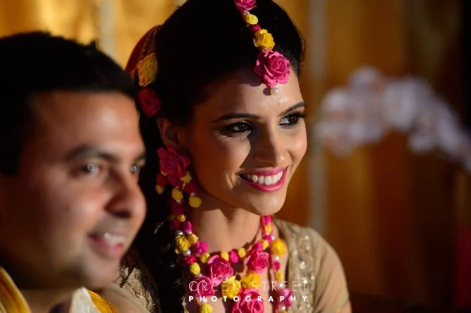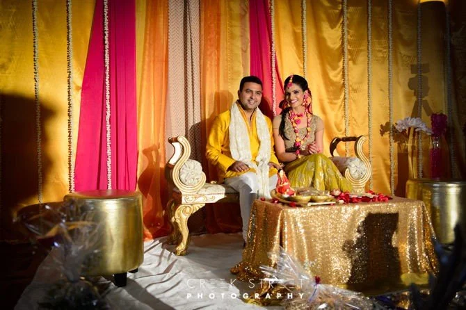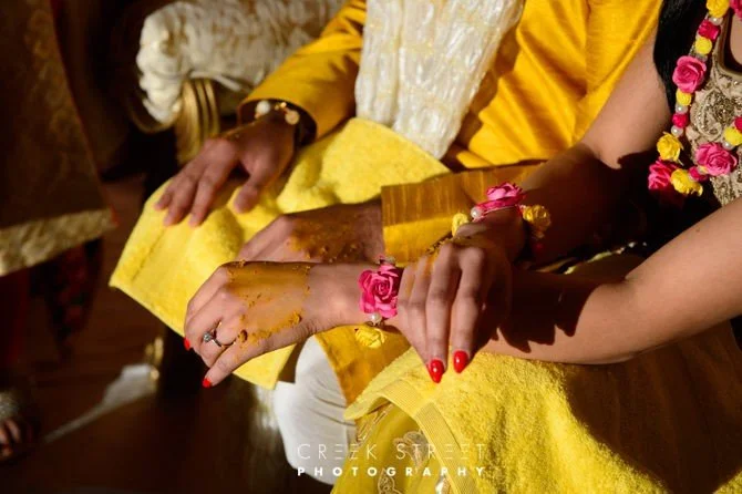 The Haldi ceremony is an ancient indian pre wedding custom involving many features. Family and guests apply “Haldi” a past of mostly turmeric on bride and groom face hands and feet. During the ceremony a Kangana – a read tread with symbols on is tied to the right wrist to the bride and groom. Lost of fantastic Indian music and off course dancing. So much colour and so much fun.